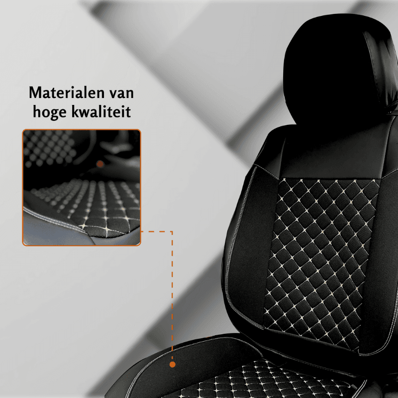 Onze premium autostoelhoezen op maat zijn perfect geschikt voor jouw specifieke automodel en ontworpen voor zowel de bestuurdersstoel, passagiersstoel als de achterbank. Dankzij de pasvorm ondersteunen ze niet-afneembare hoofdsteunen en bieden ze optimaal zitcomfort met extra versterkte flanken.Het geavanceerde 3-lagen systeem zorgt voor een combinatie van duurzaamheid, luxe en bescherming van de autostoelen. Bovendien zijn deze pasvorm autostoelhoezen volledig compatibel met zij-airbags en stoelverwarming, wat zorgt voor maximale veiligheid en comfort. De achterkant van de stoelhoezen is voorzien van ruime opbergvakken, ideaal voor het opbergen van kleine spullen zoals kaarten, tablets of accessoires.Materialen van de premium autostoelhoezen
